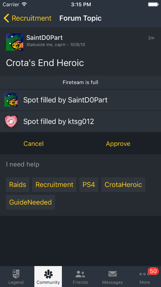 The recruitment forum group finder has been in the app since the beginning, “but it’s traditionally been a chaotic wall of potential Fireteams. We’ve had some ideas for how that could work better, and we’ve been executing on them. Very soon, we’ll be enhancing our forum with new ways to form up and roll out into the Solar System.”